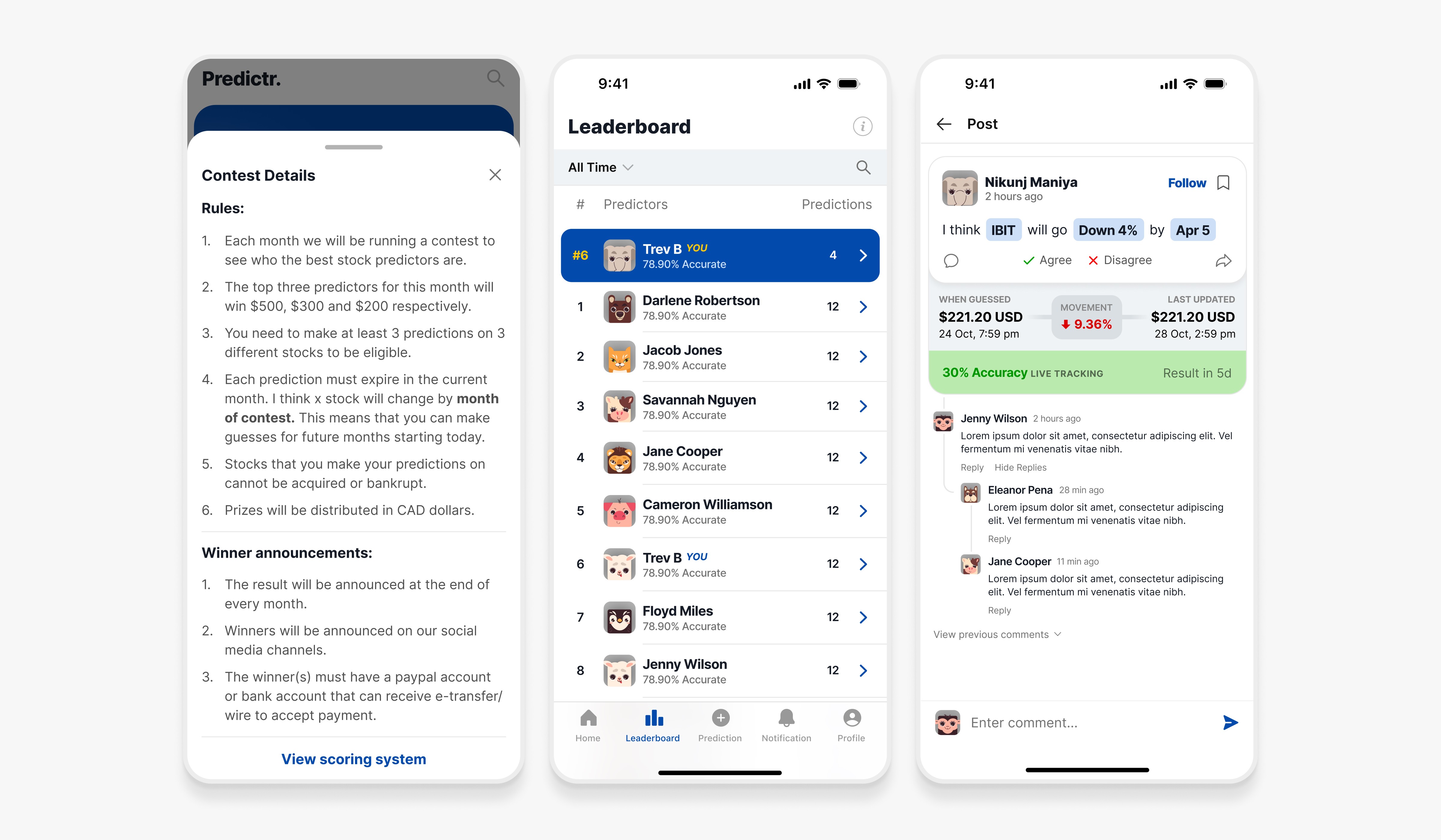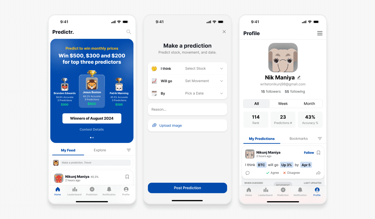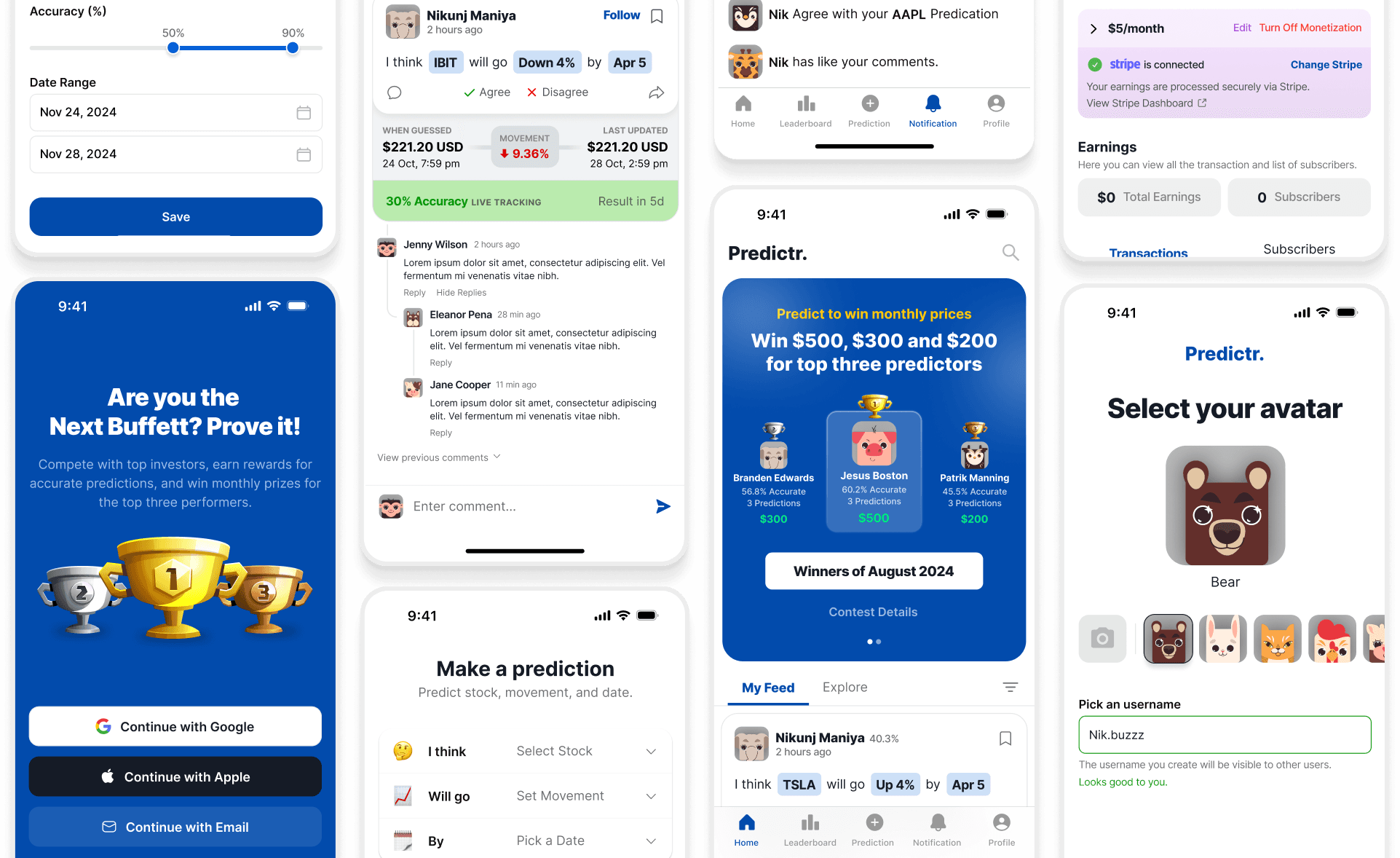 Predictr is a platform where users make real-time stock predictions, build performance history, and compete on leaderboards. Buzzinga Co. designed and developed the entire mobile app from scratch.